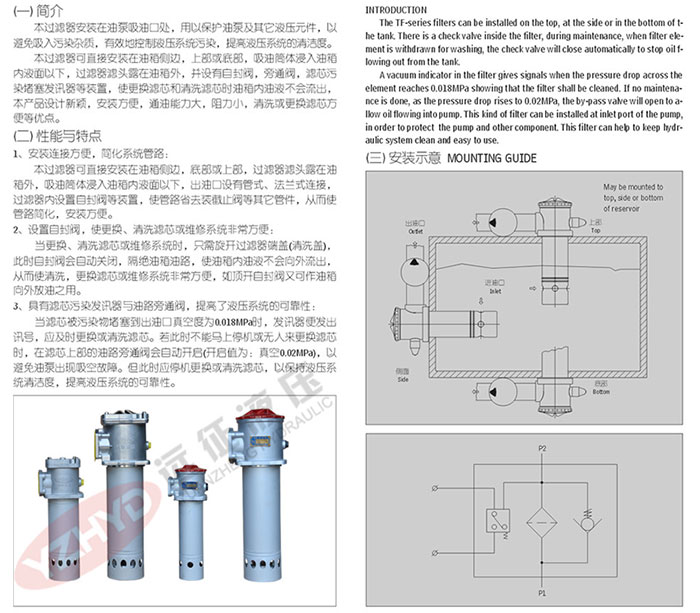 溫州遠(yuǎn)征液壓有限公司是一家集開發(fā)、生產(chǎn)、服務(wù)于一體的綜合性企業(yè),是國內(nèi)生產(chǎn)液壓輔件(液壓配件_液壓過濾器)的專 業(yè)廠家,長期以來為冶金、石油、礦山、工程、建筑、塑機、化工、機床、交通等行業(yè)的液壓設(shè)備提供配套,同時為引進(jìn)設(shè)備提供高品質(zhì)的國產(chǎn)化備件。今天遠(yuǎn)征主講TF系列箱外自封式吸油過濾器(新型結(jié)構(gòu)代替LXZ系列),詳情請看下圖:
