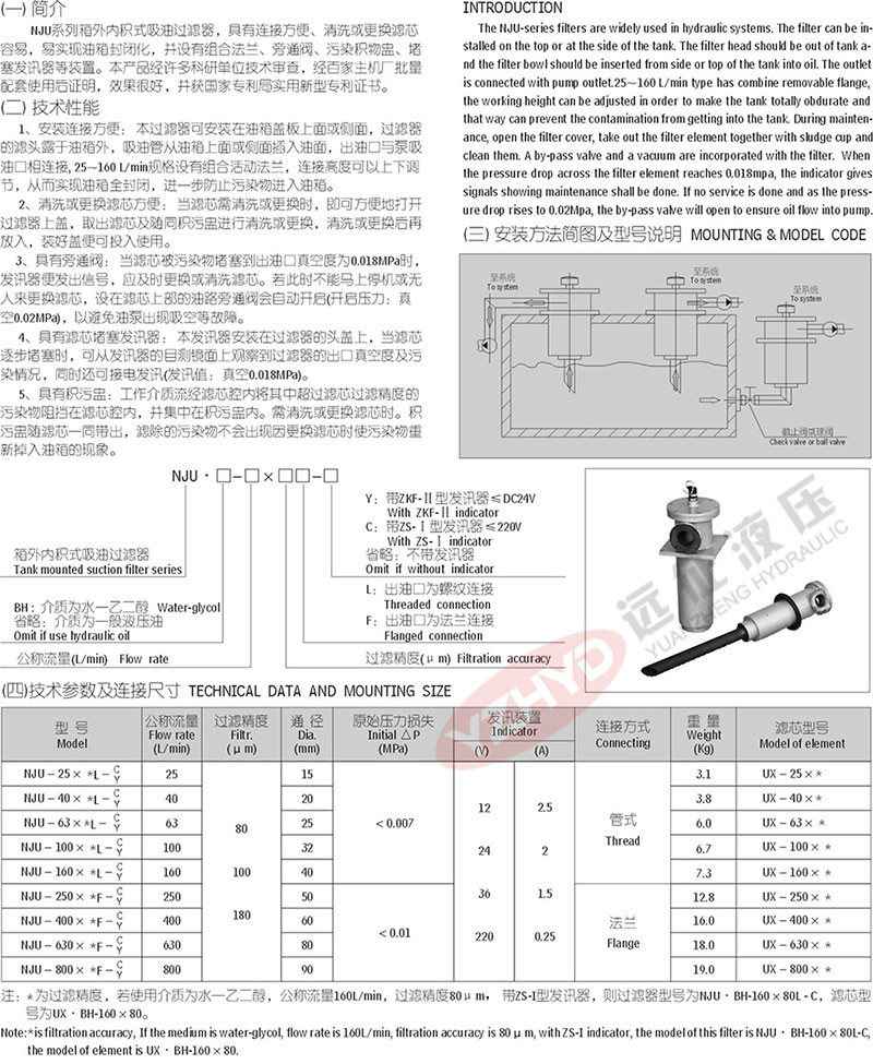 液壓配件_液壓過濾器)的專 業(yè)廠家,長(zhǎng)期以來為冶金、石油、礦山、工程、建筑、塑機(jī)、化工、機(jī)床、交通等行業(yè)的液壓設(shè)備提供配套,同時(shí)為引進(jìn)設(shè)備提供高品質(zhì)的國(guó)產(chǎn)化備件。今天遠(yuǎn)征主講NJU系列箱外內(nèi)積式吸油過濾器,詳情請(qǐng)看下圖:
